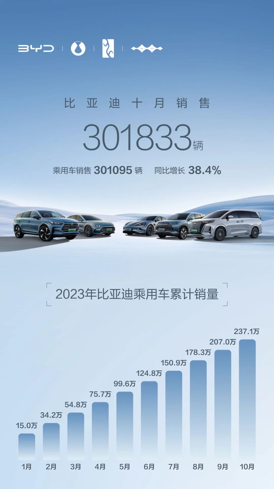 中國(guó)質(zhì)量新聞網(wǎng)訊(祝鶴)11月1日,比亞迪發(fā)布的10月銷(xiāo)售數(shù)據(jù)顯示,共計(jì)銷(xiāo)售新車(chē)301833輛,其中乘用車(chē)銷(xiāo)售301095輛,同比增長(zhǎng)38.4%。
