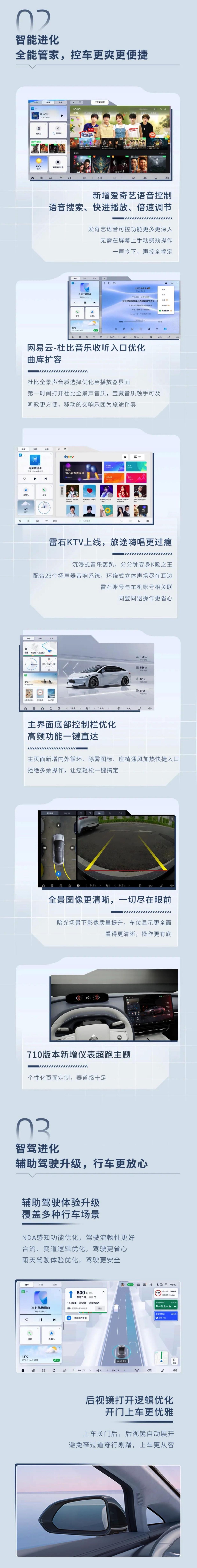 同時,對網(wǎng)易云杜比音樂收聽入口進行優(yōu)化和曲庫擴容;雷石KTV上線,并可與車機賬號關(guān)聯(lián);車機主界面底部控制欄優(yōu)化,新增內(nèi)外循環(huán)、除霧圖標、座椅通風加熱快捷入口;全景影像在暗光場景下影像質(zhì)量提升,車位顯示更全面;710版本新增儀表超跑主題。
