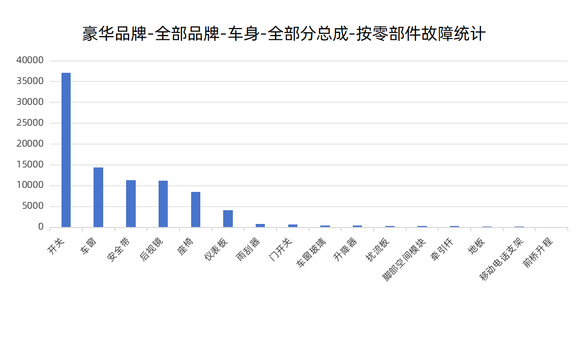 車身部分,豪華品牌車型的表現(xiàn)同樣中規(guī)中矩,累計超9萬條的維修數(shù)據(jù)在總數(shù)據(jù)樣本中占比約6.3%。在該部分,影響最大的為開關(guān)零部件,在該分總成部分占比接近50%。