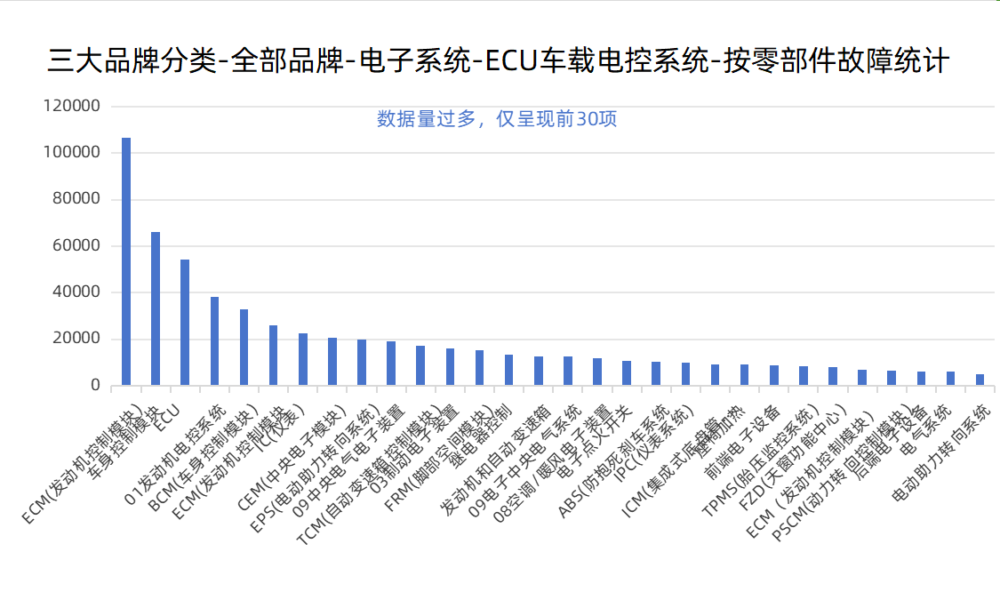 數(shù)據(jù)顯示,ECM(發(fā)動機控制模塊)、車身控制模塊、ECU、01發(fā)動機電控系統(tǒng)、BCM(車身控制模塊)為故障頻發(fā)區(qū),在有效故障數(shù)據(jù)樣本中故障數(shù)量分別為10.6余萬條、6.6余萬條、5.4余萬條、3.8余萬條以及3.2余萬條。其中,ECM(發(fā)動機控制模塊)在178條零部件故障記錄中占比高達14%。