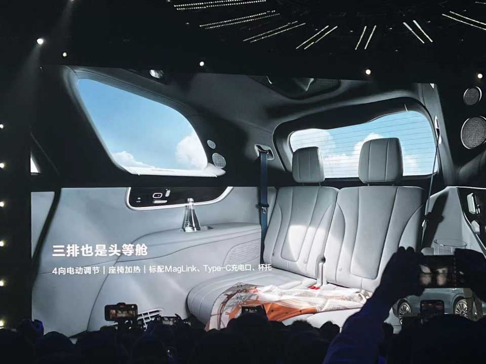 配置部分,搭載全新HarmonyOS 4與全新HUAWEI SOUND卓越系列,全車滿配10塊屏幕,隨時滿足用戶駕駛、娛樂、工作的全場景需求。還配備投影系統,配合32英寸升降式投影幕布。