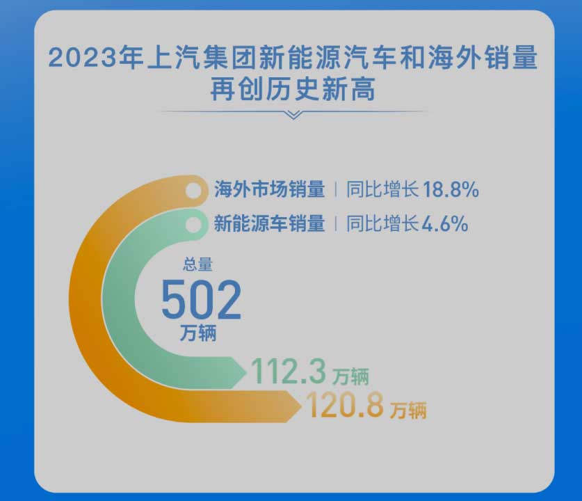 海外市場,上汽集團2023年銷量為120.8萬輛,同比增長18.8%,其中自主品牌銷量占比接近92%,新能源車銷量占比接近24%。(本文圖片來源:上汽集團)