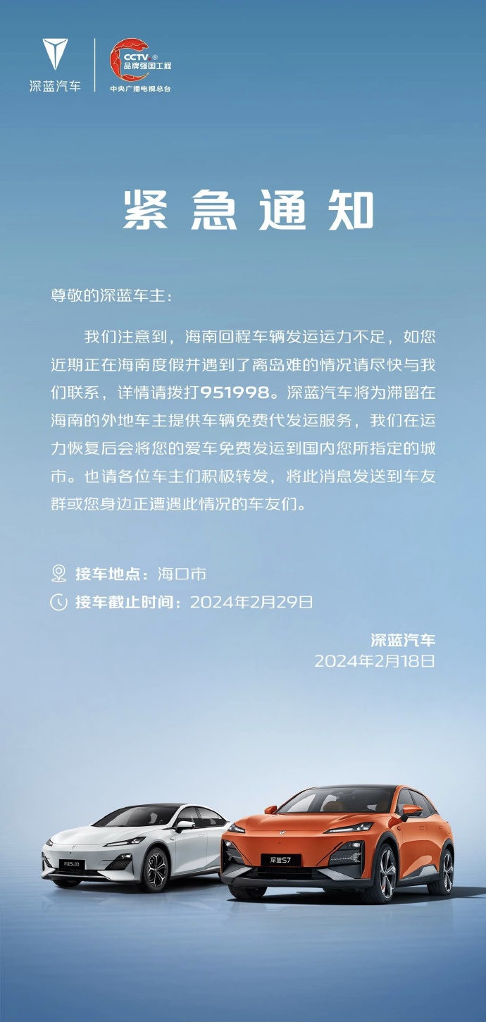 針對節(jié)后海南返程新能源車輛發(fā)運運力不足的情況,十家車企將為滯留在海南的外地品牌車主們提供車輛免費代發(fā)運服務,將在運力恢復后會將車輛免費發(fā)運到車主所指定的國內城市。