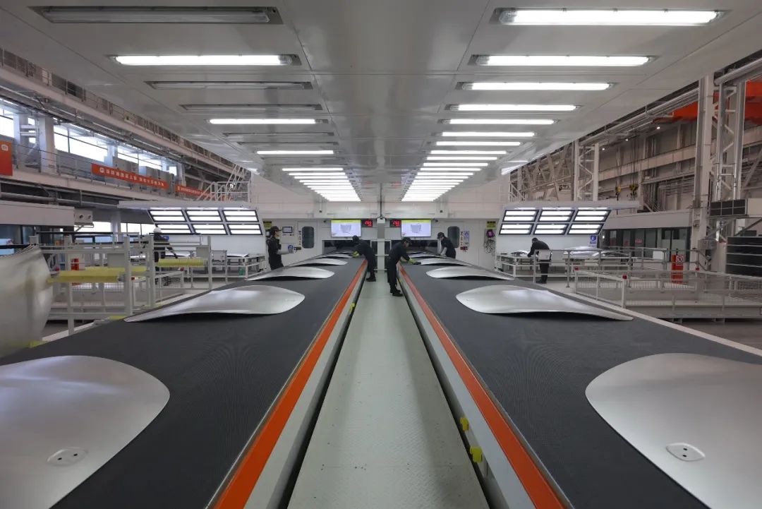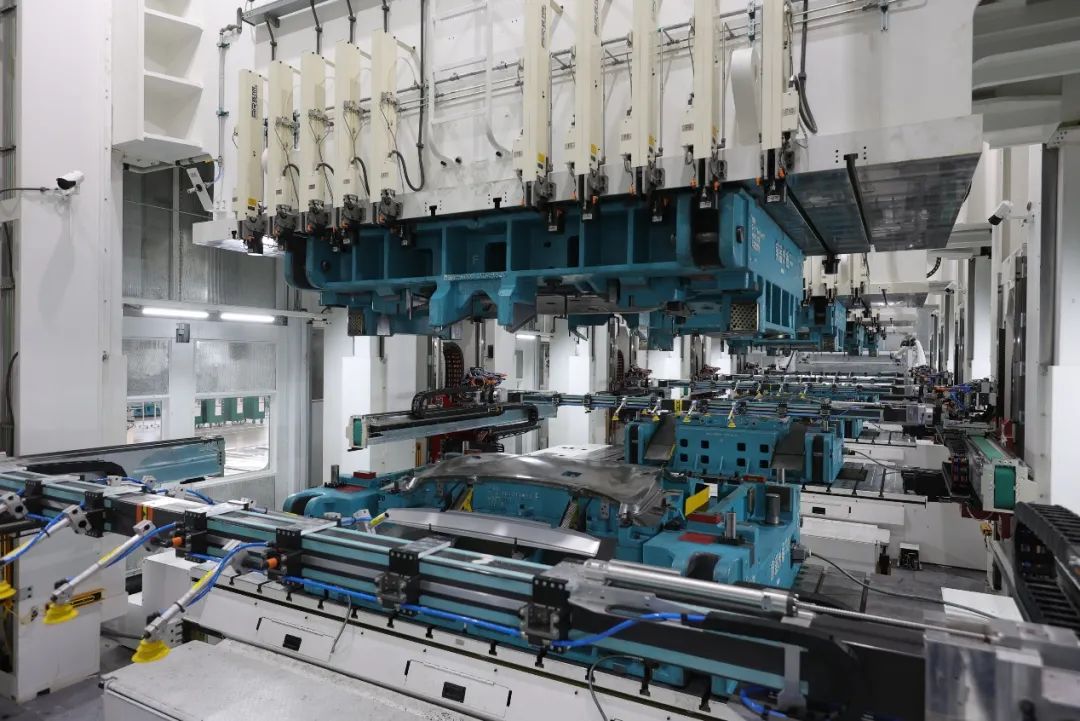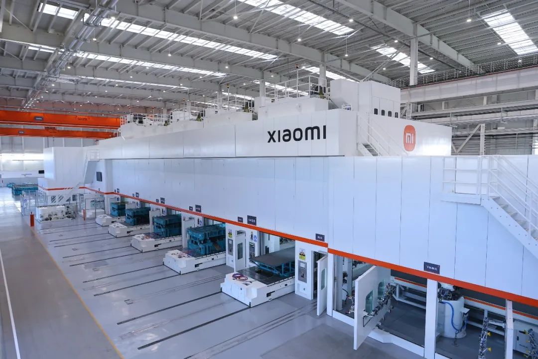 小米沖壓車間能制造SU7上的所有大型覆蓋件。這套沖壓機(jī)床由濟(jì)南二機(jī)床廠制造,瑞士古德爾提供自動(dòng)化組件,能實(shí)現(xiàn)五序、 鋼鋁材料混線生產(chǎn),技術(shù)水平十分先進(jìn)。