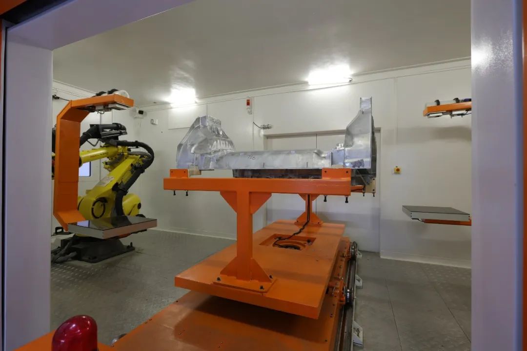 由壓鑄車間和沖壓車間生產(chǎn)好的零件通過AMR物流機(jī)器人運(yùn)輸?shù)酱?,整個(gè)車身工廠配備近200臺(tái)AMR物流機(jī)器人。AMR物流機(jī)器人不需要電磁感應(yīng)式引導(dǎo)線,全部采用激光雷達(dá)感知方案,通過AI算法實(shí)現(xiàn)自主運(yùn)輸。