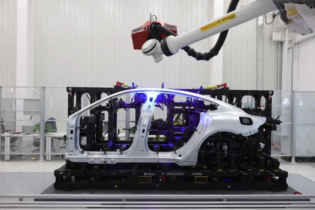 車身車間,機(jī)器人將在SU7車身共計(jì)連接2340個(gè)點(diǎn),并涂上92米長的結(jié)構(gòu)膠,實(shí)現(xiàn)100%全自動(dòng)連接,形成小米SU7的鋼鋁混合車身骨架。