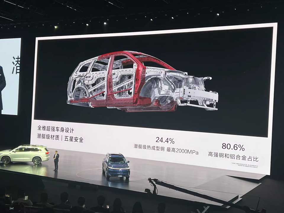 被動安全方面,采用全維超強車身設(shè)計,抗拉強度最高2000MPa的潛艇級熱成型鋼占比24.4%;高強度鋼和鋁合金占比達80.6%。其中,前乘員艙核心骨架結(jié)構(gòu)100%采用潛艇級熱成型鋼,帶來全維超強車身設(shè)計與五星安全。