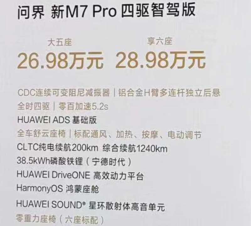 電池方面,38.5kWh磷酸鐵鋰電池從30%充電至80%僅需18分鐘,綜合續(xù)航1290km。電池擁有五重結(jié)構(gòu)安全設(shè)計、五層電芯安全保護、三重特種耐熱沖擊防爆,高強度防撞梁以及華為云端BMS管理保證安全。