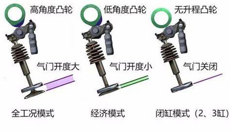 兩缸超經(jīng)濟(jì)模式:適用于中低速勻速、減速、下坡行駛,中間兩缸的氣門升程為0(即閉缸)。