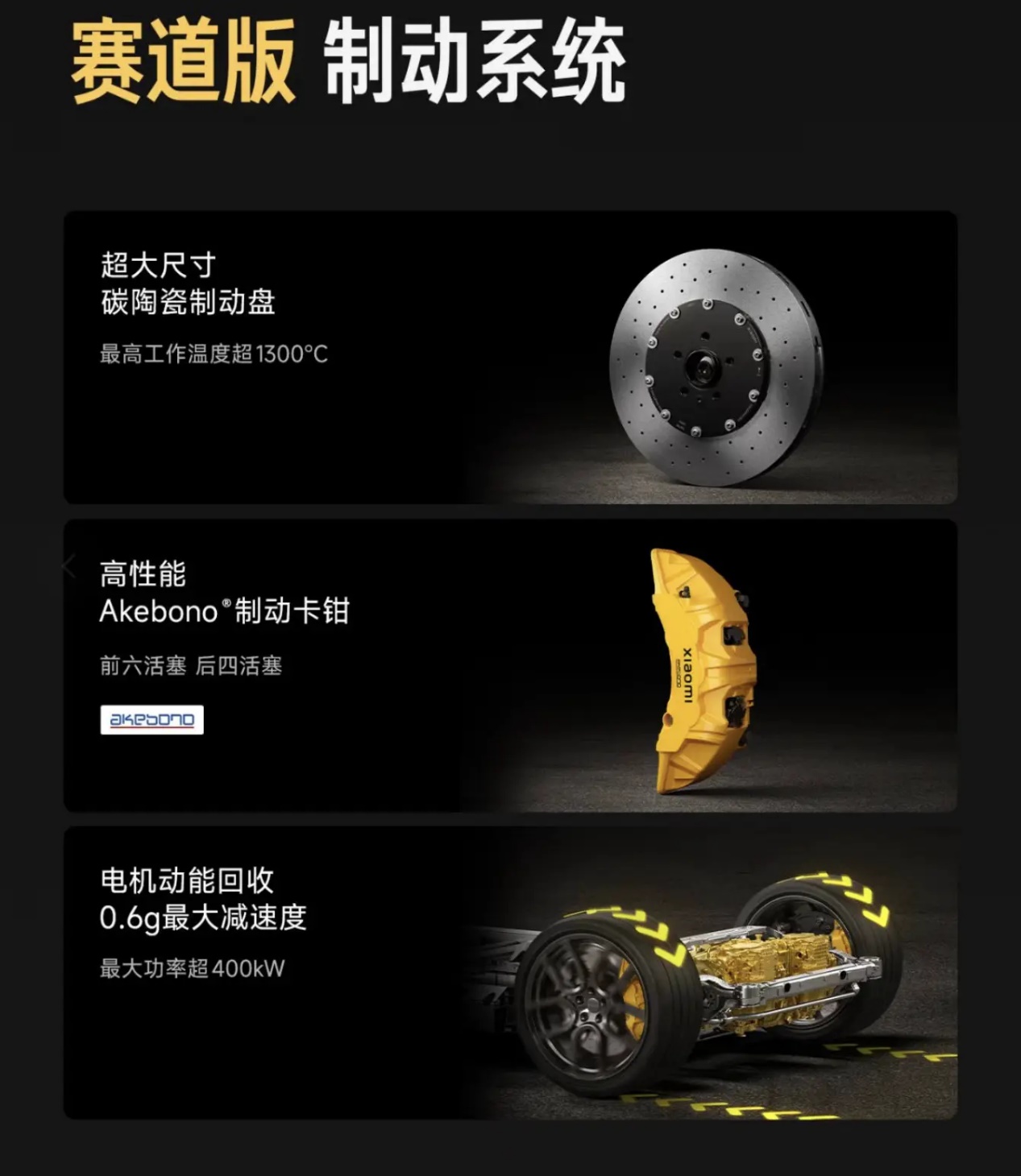 小米SU7 Ultra長寬高數(shù)據(jù)為5070(5115)mm×1970mm×1465mm,軸距為3000mm。相比普通SU7車型,小米SU7 Ultra搭載許多空氣動(dòng)力套件,配合各種碳纖維件,營造強(qiáng)大氣場(chǎng),配合碳陶瓷制動(dòng)盤和前六活塞Akebono黃色制動(dòng)卡鉗,視覺效果上更具張力。