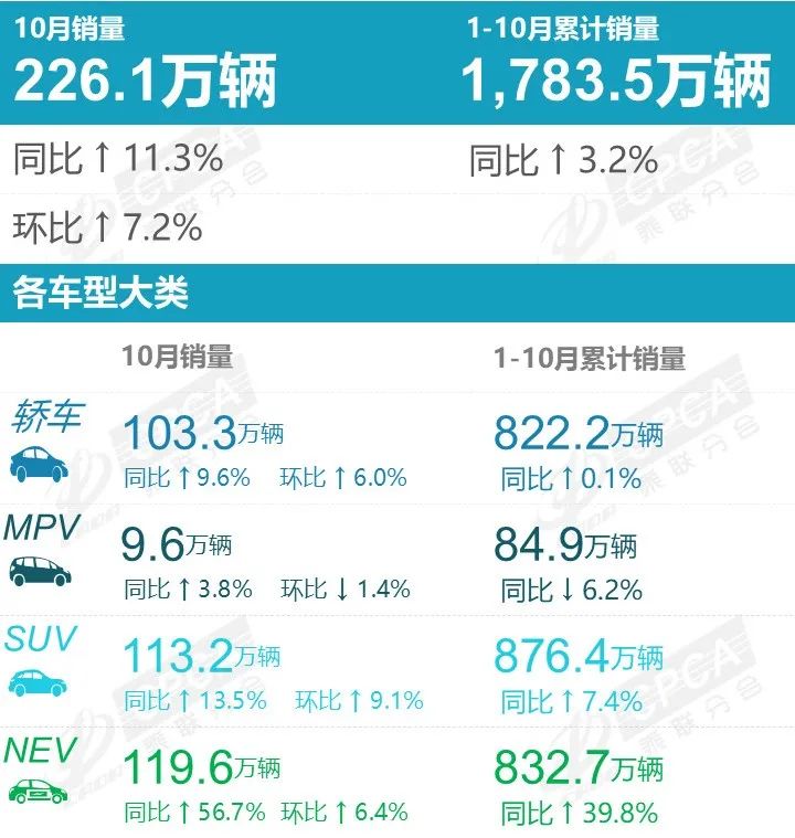乘聯(lián)分會數(shù)據(jù)顯示,10月全國狹義乘用車零售226.1萬輛,其中常規(guī)燃油車零售106.6萬輛,同比下降16.1%。新能源乘用車市場零售119.6萬輛,同比大幅度增長56.7%。10月,國內(nèi)新能源車零售滲透率達(dá)到52.9%,這也是繼7月以來新能源市場滲透率連續(xù)4個月超過50%。