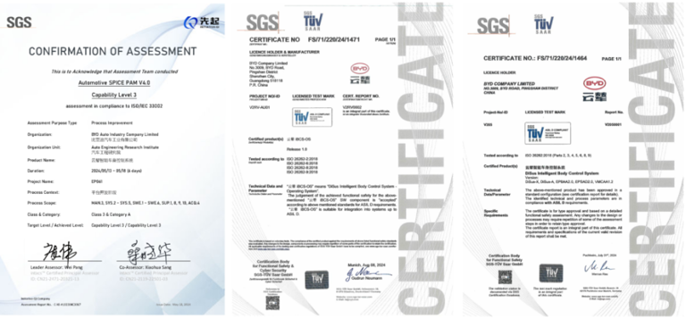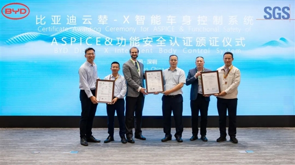 近日,SGS(通標(biāo)標(biāo)準(zhǔn)技術(shù)服務(wù)有限公司)為比亞迪云輦-X智能車身控制系統(tǒng)頒發(fā)了三大證書。