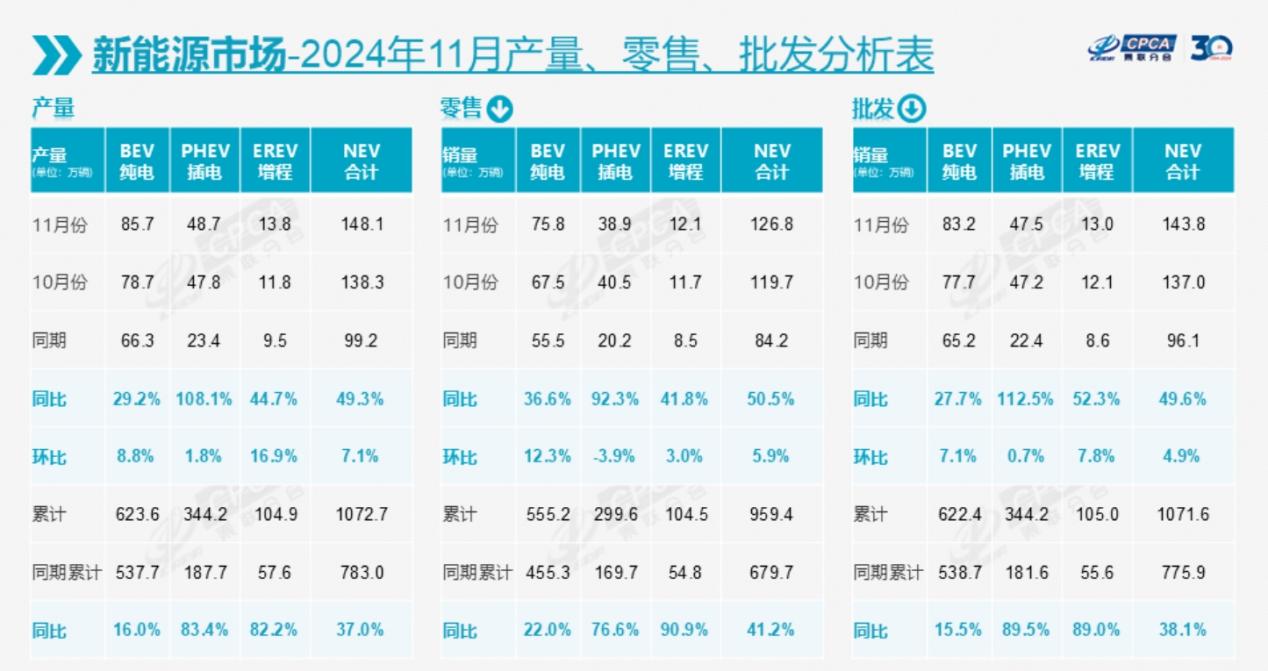 由于購買新能源車的補貼力度更大,因此在以舊換新政策的促進下,新能源車的銷量顯著提升。乘聯(lián)分會公布的數(shù)據(jù)顯示,11月新能源乘用車市場零售126.8萬輛,同比增長50.5%,環(huán)比增長5.9%。2024年1-11月零售959.4萬輛,同比增長41.2%。