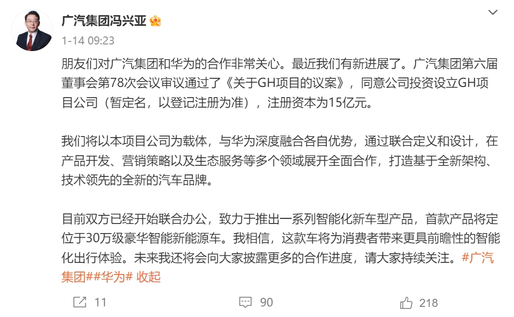 此前,廣汽集團(tuán)已投資設(shè)立GH項(xiàng)目公司,新公司注冊(cè)資本為15億元。以此為載體,廣汽集團(tuán)與華為深度融合各自優(yōu)勢(shì),通過(guò)聯(lián)合定義和設(shè)計(jì),在產(chǎn)品開(kāi)發(fā)、營(yíng)銷策略以及生態(tài)服務(wù)等多個(gè)領(lǐng)域展開(kāi)全面合作,打造基于全新架構(gòu)、技術(shù)領(lǐng)先的全新汽車品牌。