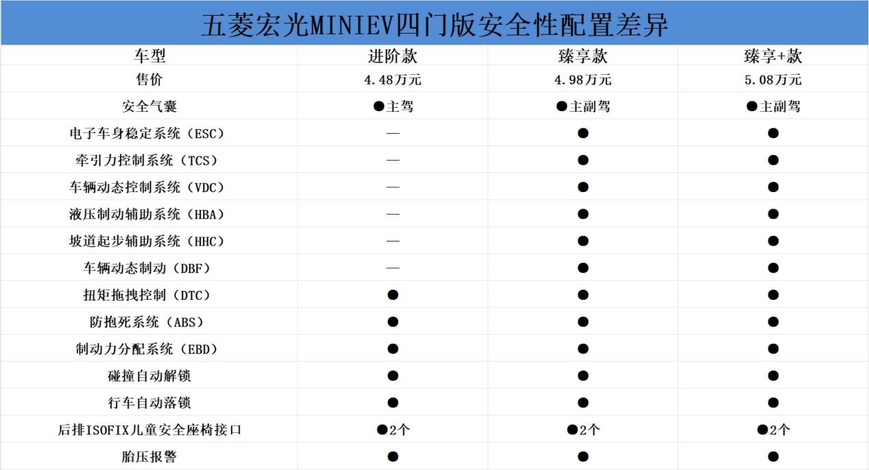 消費者購車時,不論購買哪種類型的車型都會關注安全性能。五菱宏光MINIEV四門版具備較為豐富的主被動安全配置。從臻享款開始,車輛就配備主副駕安全氣囊,以及電子車身穩(wěn)定系統(tǒng)、牽引力控制系統(tǒng)、車輛動態(tài)控制系統(tǒng)等。這些配置在極端駕駛情況下能有效保持車身穩(wěn)定,減少因緊急操作或惡劣路況引發(fā)的安全風險。從安全性功能方面來看,臻享款和臻享+款更值得考慮。
