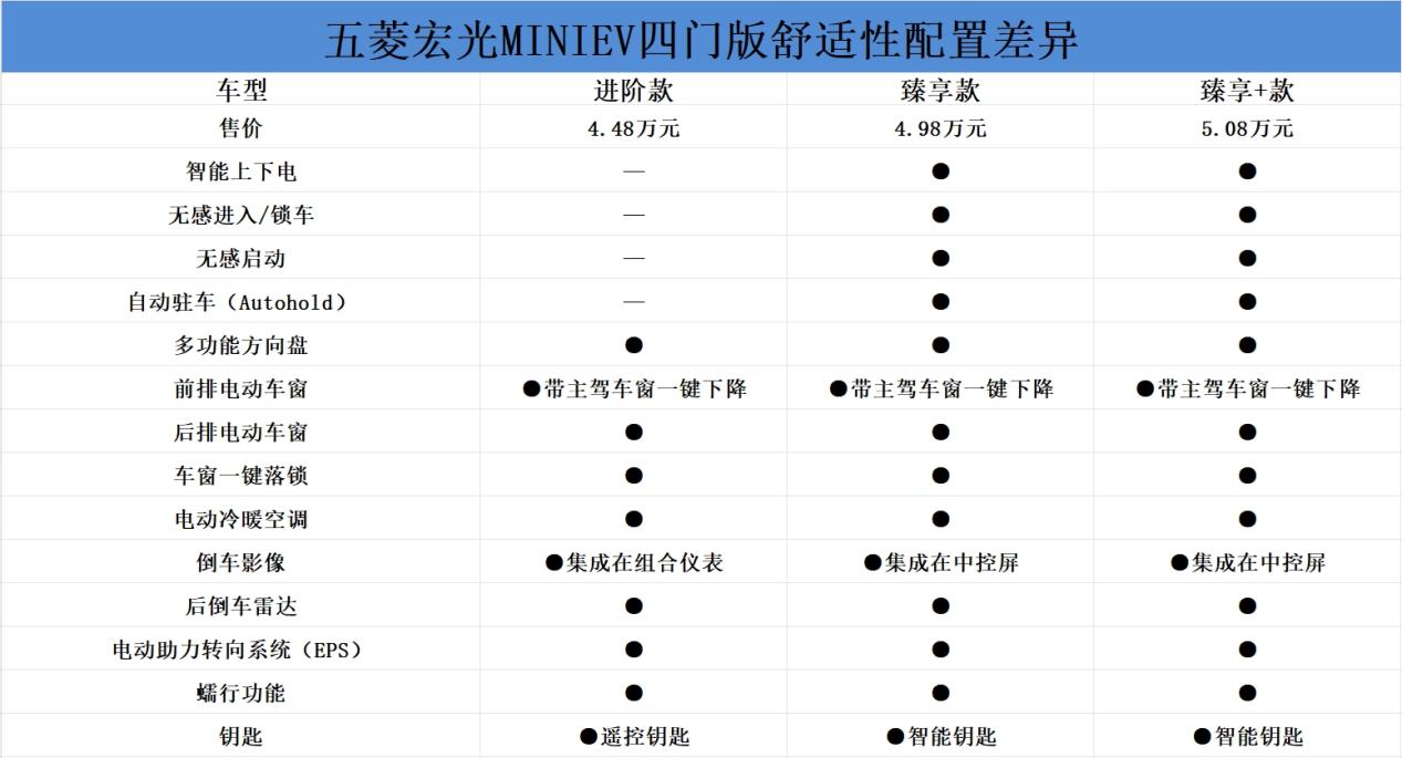 舒適性上,入門版車型與其它兩款差異逐漸顯現(xiàn),雖然五菱宏光MINIEV四門版標配多功能方向盤、車窗一鍵落鎖、倒車影像、后倒車雷達,但從中配的臻享款才配備智能上下電、無感進入/鎖車、無感啟動和自動駐車功能。其中,自動駐車功能在新能源車型中較為常見,配備該功能的車輛在停車等紅綠燈等類似情況時無需打開電子手剎或是換擋,進一步簡化操作。