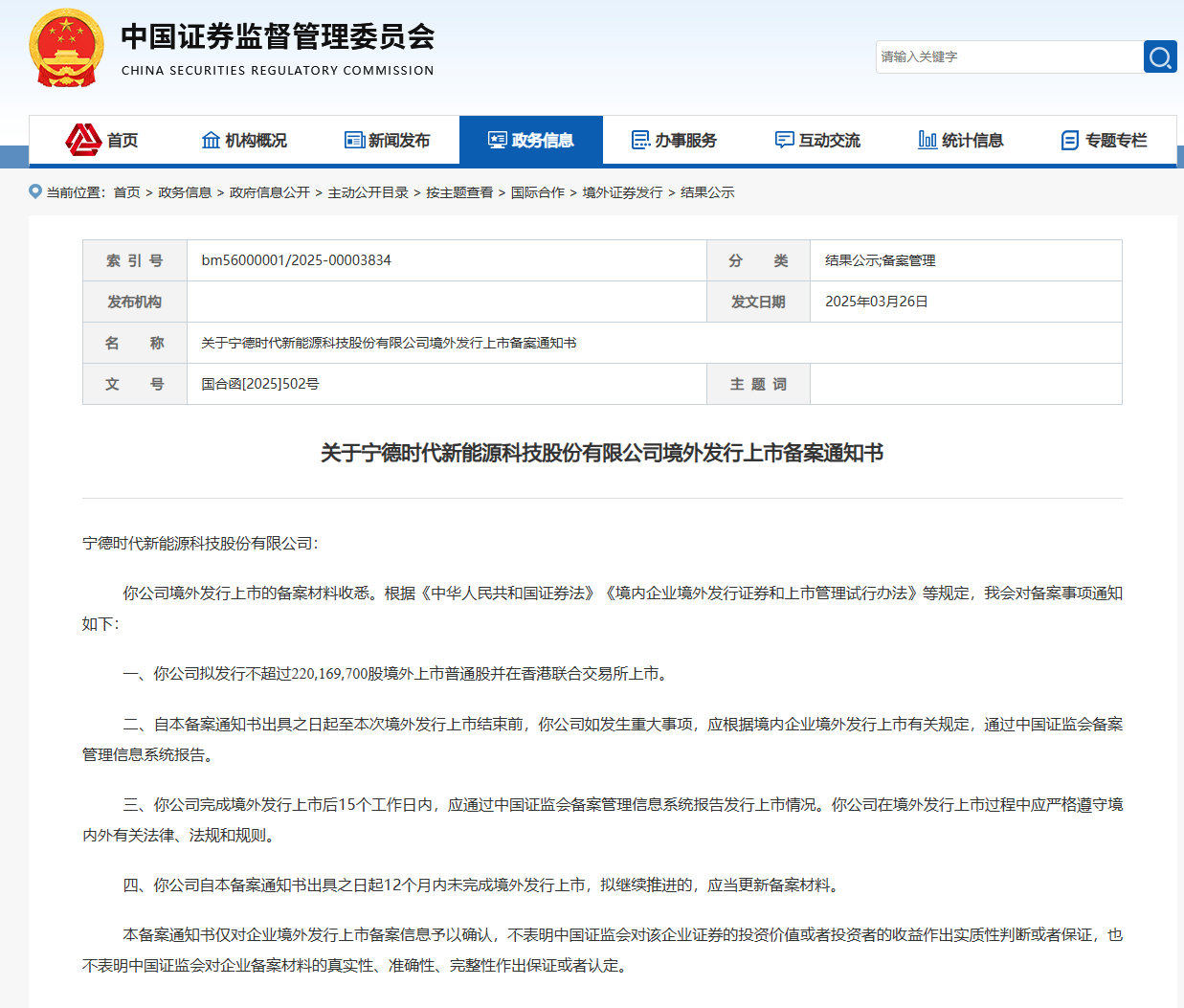 《備案通知書》顯示,寧德時(shí)代擬發(fā)行不超過220169700股境外上市普通股,并在香港聯(lián)交所上市。