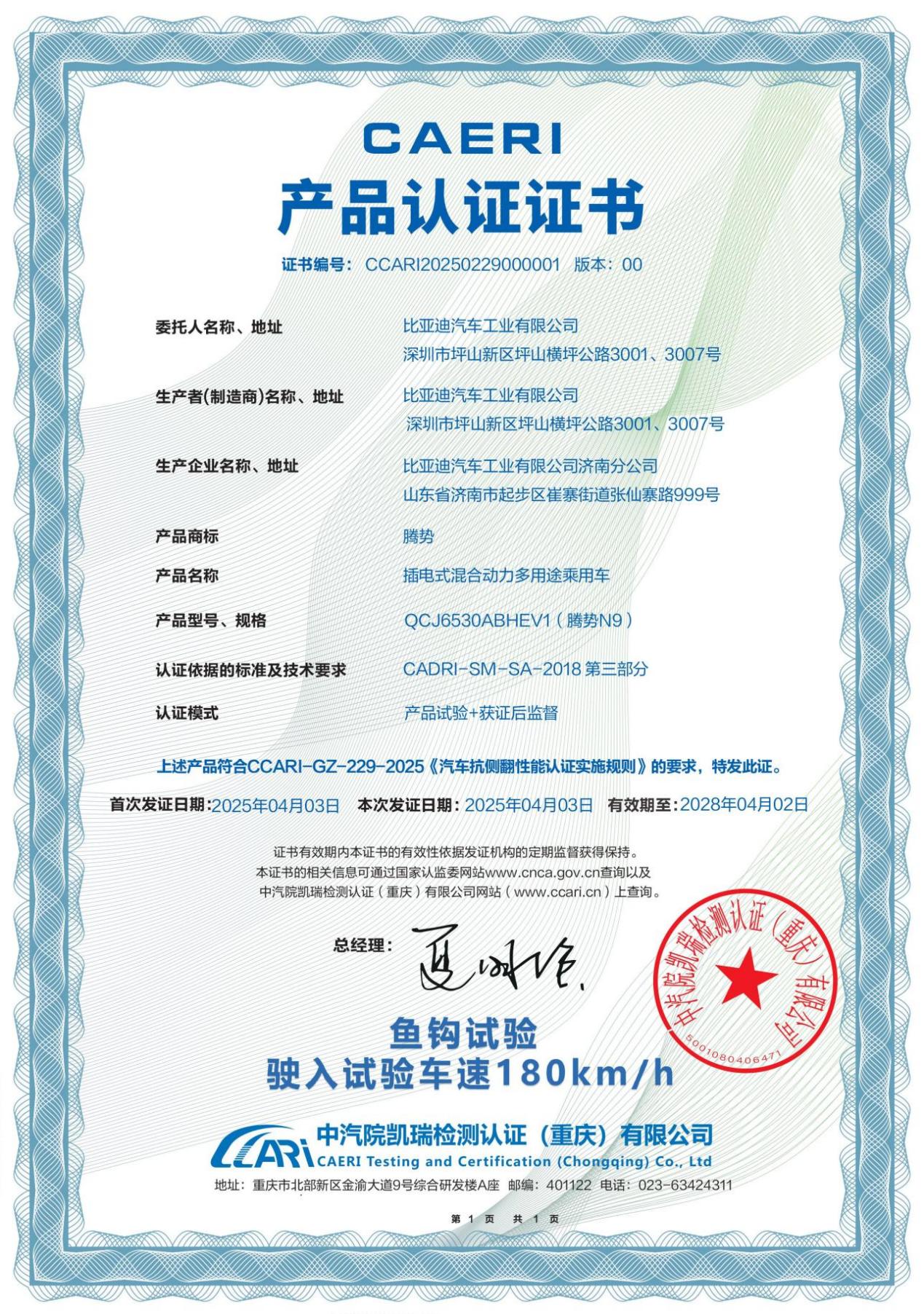 4月16日,騰勢(shì)N9通過(guò)中國(guó)汽研測(cè)試認(rèn)證,以180km/h的速度通過(guò)魚(yú)鉤測(cè)試,超過(guò)國(guó)際標(biāo)準(zhǔn)(80km/h)兩倍以上。
