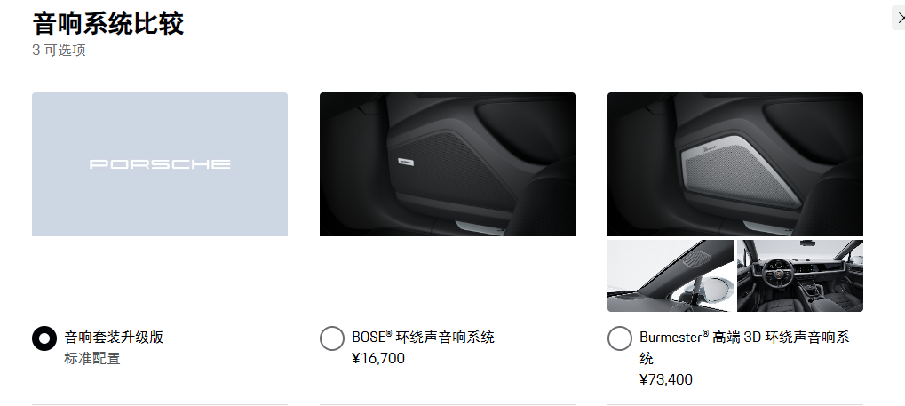 傳統(tǒng)名牌高級(jí)音響也曾是高端車型的標(biāo)志。為滿足消費(fèi)者的聽覺需求,汽車上耳熟能詳?shù)囊纛l廠商包括BOSE、柏林之聲、哈曼卡頓、寶華韋健、馬克萊文森等與車企合作,推出的音響選配價(jià)格高達(dá)數(shù)萬(wàn)元一套。如保時(shí)捷卡宴提供2款選配音響,BOSE音響價(jià)格為16700元,而柏林之聲的價(jià)格高達(dá)73400元。