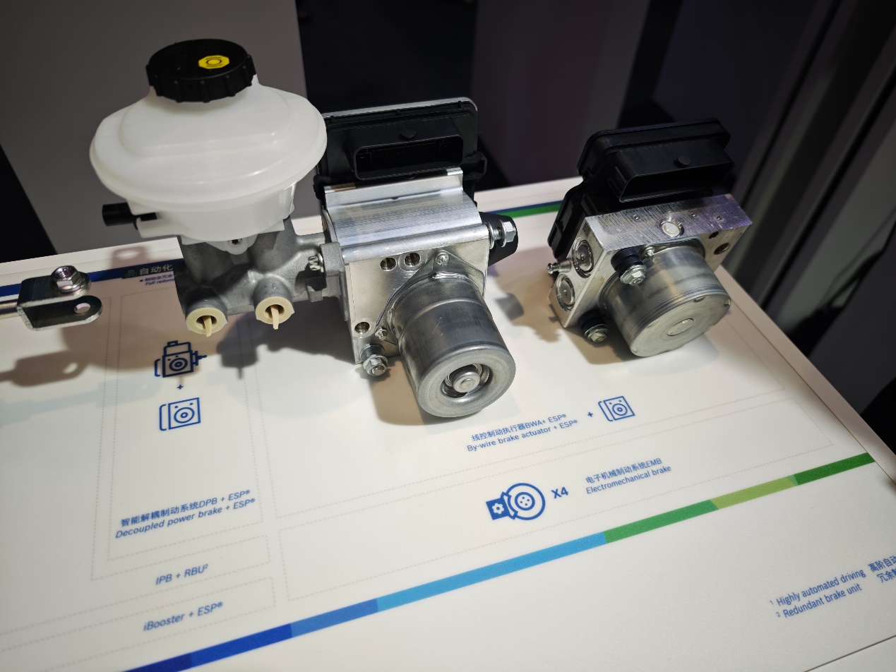 在線控制動(dòng)領(lǐng)域,博世展示兩種技術(shù)路線方案。其一是全干式電子機(jī)械制動(dòng)(EMB),取消制動(dòng)液和液壓管路,簡(jiǎn)化生產(chǎn)工藝。此外,博世提供基于成熟制動(dòng)組件的液壓線控制動(dòng)執(zhí)行器BWA+ESP解決方案,可實(shí)現(xiàn)快速量產(chǎn)落地。