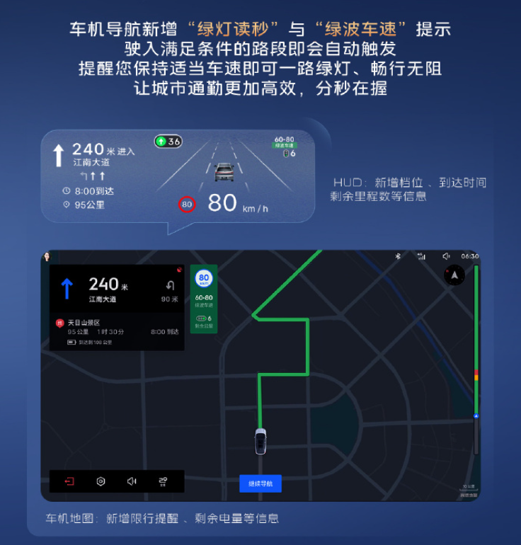 其中,車機(jī)導(dǎo)航新增綠燈讀秒與綠波車速提示,顯示車機(jī)導(dǎo)航界面,標(biāo)注“綠燈讀秒”“綠波車速”提示,駛?cè)胩囟范巫詣?dòng)觸發(fā),幫助保持車速實(shí)現(xiàn)一路綠燈,有助于提升城市通勤效率。