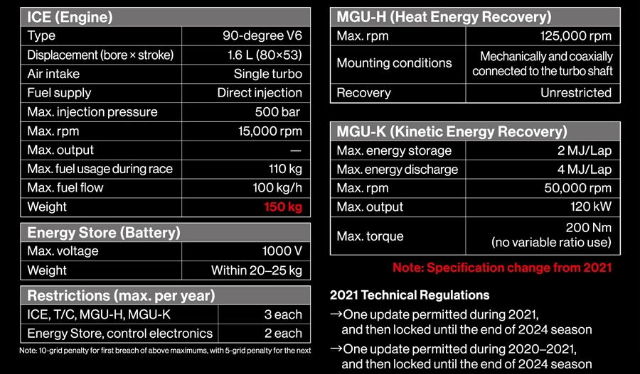 目前的規(guī)則從2014年開始實行,新的動力裝置法規(guī)要求,發(fā)動機僅允許使用四沖程活塞式發(fā)動機,排量為1.6L,氣缸數(shù)6缸,六個氣缸容量必須相同,呈90度“V”型排列,最大缸徑為80毫米±0.1毫米、最小氣門桿直徑為5毫米、最大直噴噴油器壓力為500bar,僅限單個渦輪增壓器,渦輪增壓器必須與曲軸軸線平行布置,火花塞每次點火能量不超過120mJ等。同時,新規(guī)還增加了動能回收(MGU-K)和熱能回收(MGU-H)兩大系統(tǒng),因此F1的發(fā)動機也不單單是發(fā)動機了,準(zhǔn)確的叫法稱為動力單元(Power Unit)。