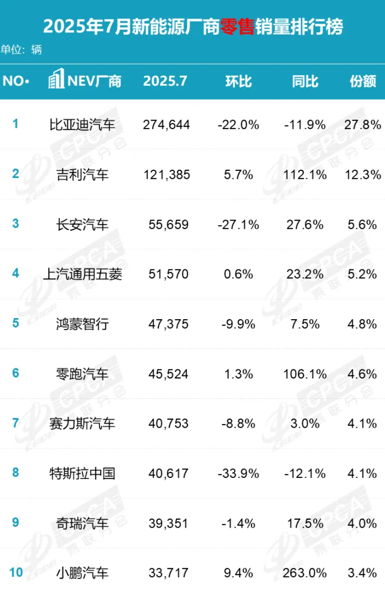 比亞迪以274644輛的銷量成績穩(wěn)居榜首,但同比下降11.9%,市場份額27.8%;吉利汽車7月零售新能源車121385輛,同比增長達(dá)到112.1%。吉利汽車新能源轉(zhuǎn)型能夠獲得顯著成效,離不開旗下三大品牌的協(xié)同發(fā)力,吉利銀河是品牌增長主力,領(lǐng)克品牌貢獻(xiàn)穩(wěn)定增量,而極氪則延續(xù)穩(wěn)健上升態(tài)勢。