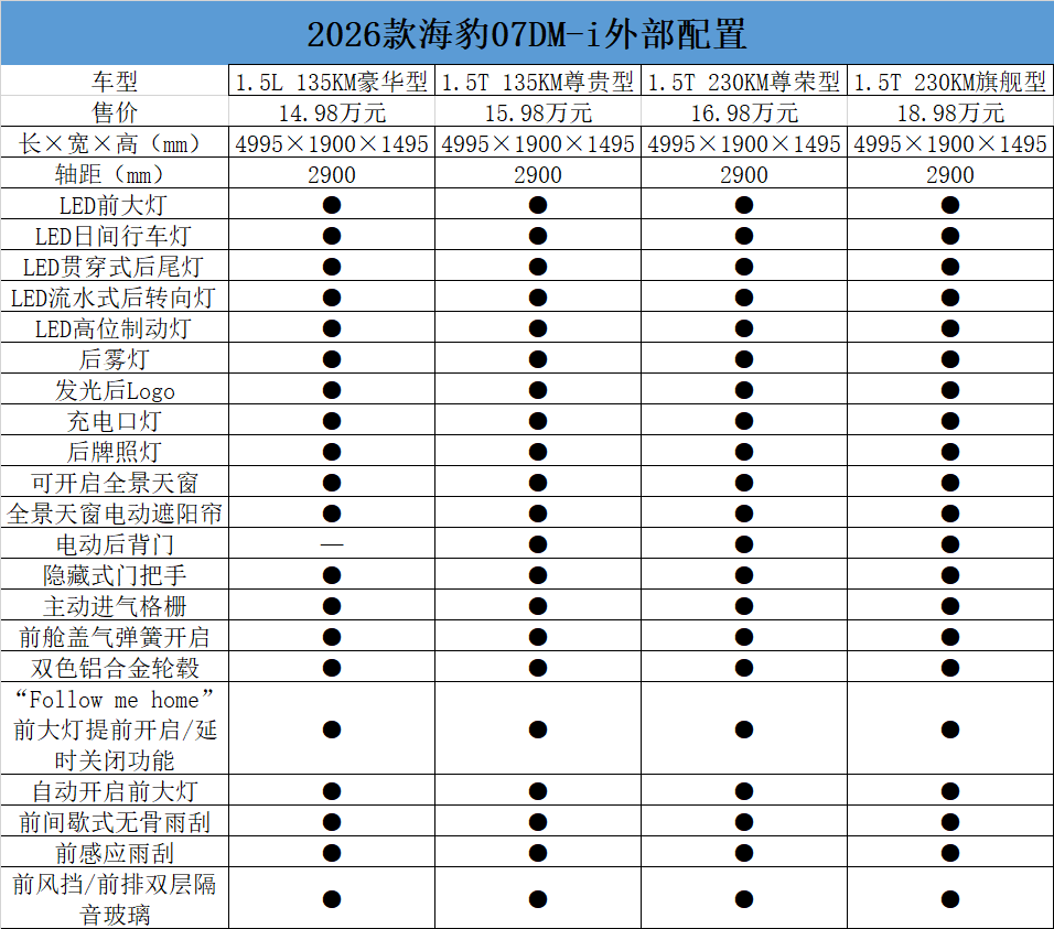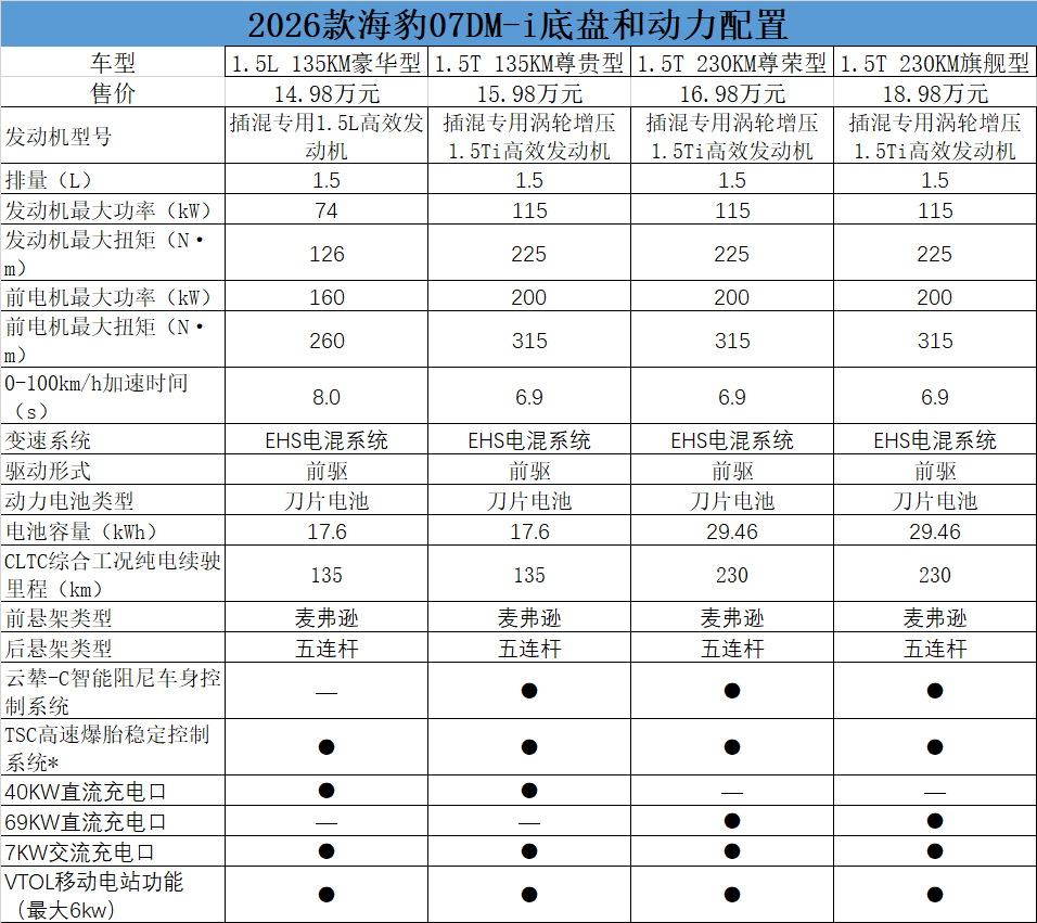 本次發(fā)布的2026款海豹07DM-i四個(gè)配置由低到高分別為1.5L 135KM豪華型,1.5T 135KM尊貴型、1.5T 230KM尊榮型、1.5T 230KM旗艦型,售價(jià)分別為14.98萬(wàn)元、15.98萬(wàn)元、16.98萬(wàn)元、18.98萬(wàn)元。定位“智美新奢座駕”,基于全新一代插混整車(chē)平臺(tái)打造,采用全新海洋美學(xué)設(shè)計(jì)語(yǔ)言,長(zhǎng)寬高分別為4995×1900×1495mm,軸距為2900mm。
