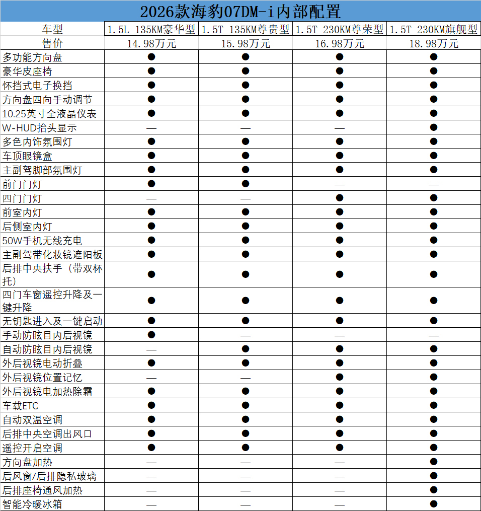 9月15日,2026款海豹07DM-i上市,推出4個(gè)配置版本,指導(dǎo)價(jià)14.98萬(wàn)元—18.68萬(wàn)元。新車(chē)在“智能、舒適、性能、顏值、安全”五大維度升級(jí),新增云輦-C智能阻尼車(chē)身控制系統(tǒng)、TSC高速爆胎穩(wěn)定控制系統(tǒng)及天神之眼B-輔助駕駛激光版等配置。4個(gè)版本應(yīng)該如何選擇呢?