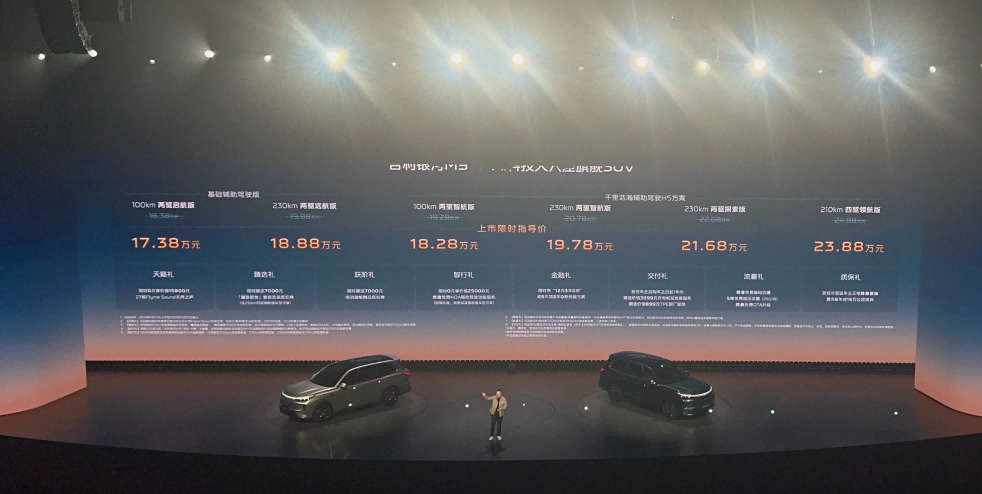 9月17日,被譽(yù)為“AI時(shí)代新汽車”的吉利銀河M9在“AI之城”杭州上市,推出6款配置車型——210km四驅(qū)領(lǐng)航版、230km兩驅(qū)探索版、230km兩驅(qū)智航版、100km兩驅(qū)智航版、230km兩驅(qū)遠(yuǎn)航版及100km兩驅(qū)啟航版。疊加限時(shí)超級(jí)置換金10000元權(quán)益后,上市限時(shí)指導(dǎo)價(jià)17.38萬(wàn)元-23.88萬(wàn)元。