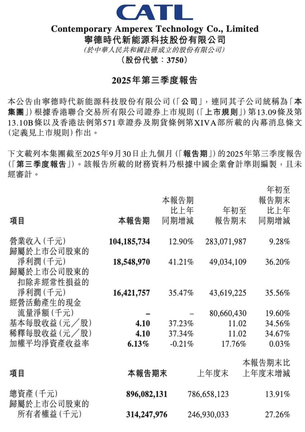 10月21日,寧德時(shí)代發(fā)布2025年第三季度財(cái)報(bào),營(yíng)收總額1041.9億元,同比增長(zhǎng)12.9%;第三季度凈利潤(rùn)為185億元,同比增長(zhǎng)41%;扣除非經(jīng)常性損益的凈利潤(rùn)為164億元,同比增長(zhǎng)35%。