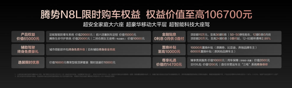 為回饋廣大用戶的支持與信賴,騰勢N8L推出限時購車權(quán)益,權(quán)益價值至高10.67萬元。包括價值1.7萬元的三年免息,最高1萬元的置換補貼。此外還有購置稅差額保障:在2025年11月30日24點前完成合同簽署的用戶,如果因非用戶原因車輛未及時交付,導致開票實際發(fā)生在2026年,可享受購置稅差額補貼,最高1.5萬元。