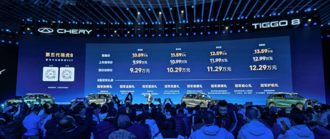 11月10日,全新第五代瑞虎8上市,推出4個版本,指導(dǎo)價9.99萬元-12.99萬元,限時搶先價9.29萬元-12.29萬元。
