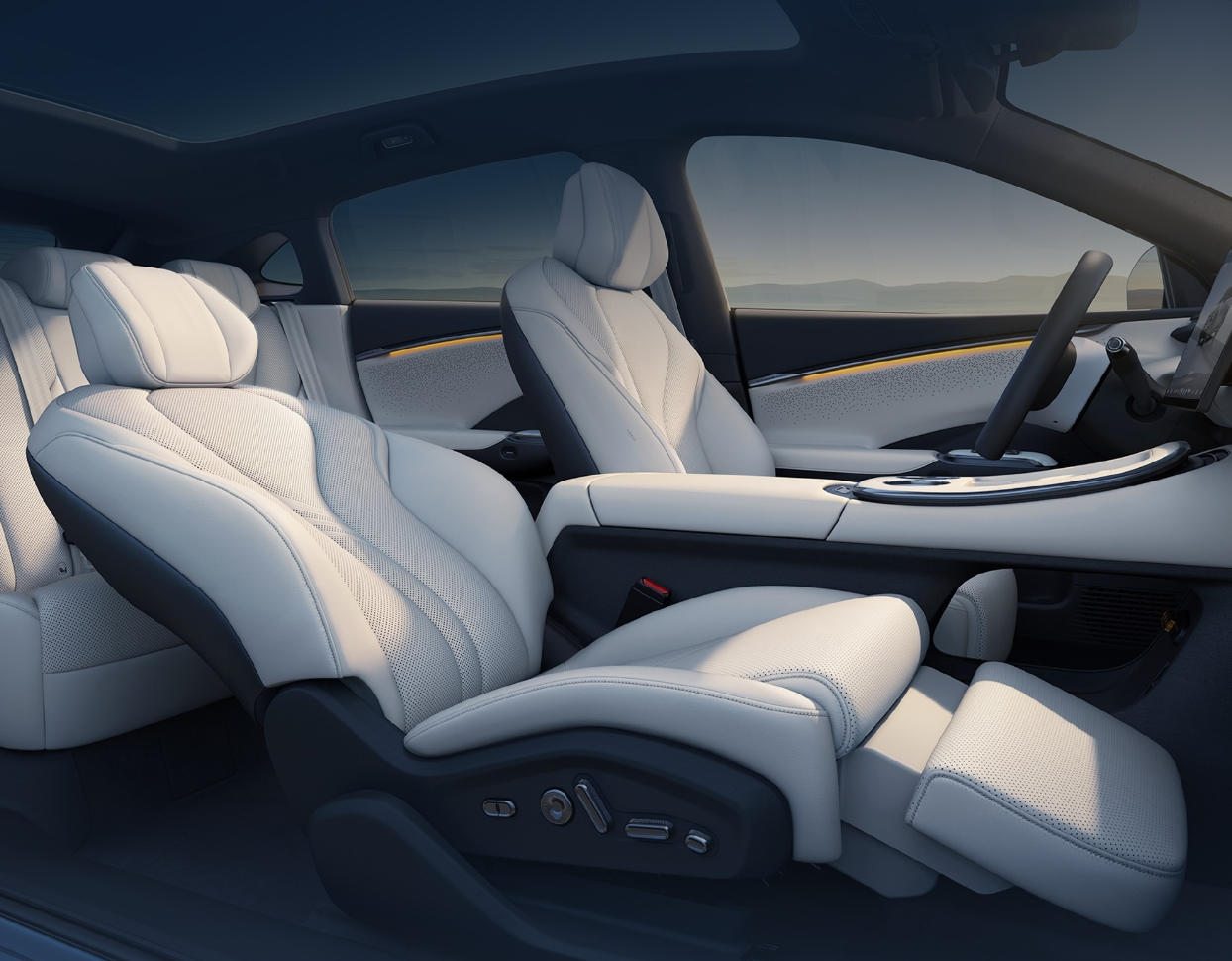 內(nèi)飾部分采用全新設(shè)計(jì),三塊大尺寸屏幕使車內(nèi)的科技感大幅提升。中控臺(tái)采用偏向駕駛席一側(cè)的設(shè)計(jì),配合平底方向盤營(yíng)造出較強(qiáng)的運(yùn)動(dòng)氛圍。舒適配置層面,高配車型配備前排座椅通風(fēng)、加熱和按摩,Bang&Olufsen音響系統(tǒng),包含頭枕音響等。