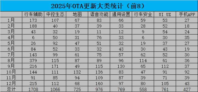 2025年全年行車輔助類更新達(dá)到了1708項(xiàng)。其次為中控生態(tài)類1066項(xiàng),接下來是語音功能976項(xiàng),地圖、通用設(shè)置、UI/UX更新都達(dá)到700多項(xiàng),關(guān)乎行車安全的為558項(xiàng),最后是手機(jī)APP更新427項(xiàng)。