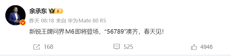 2月2日,華為常務(wù)董事、產(chǎn)品投資評審委員會主任、終端BG董事長余承東發(fā)文稱:“新銳王牌問界M6即將登場,‘56789’湊齊,春天見!”新車定位為中大型SUV,將于春季正式發(fā)布。