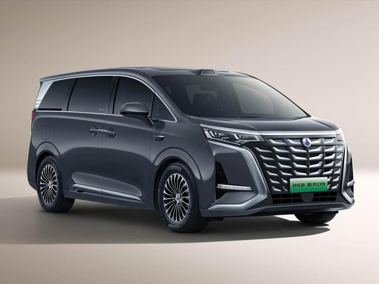 騰勢D9外觀設(shè)計(jì)契合宜商宜家,前臉采用大尺寸“龍顏”進(jìn)氣格柵(混動(dòng)版)或封閉式格柵(純電版),搭配造型犀利的LED大燈組,車身側(cè)面線條平直流暢,貫穿式腰線拉伸車身視覺長度,車窗周圍配備鍍鉻飾條,搭配大尺寸多輻式輪轂,提升車輛檔次感。車尾采用貫穿式尾燈,造型簡約大氣,適合商務(wù)接待,也適合家庭出行。