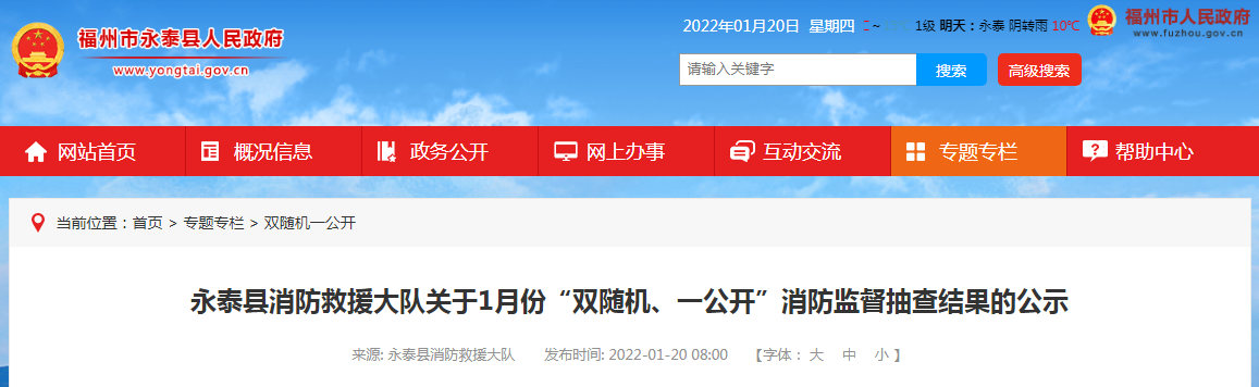 中國質(zhì)量新聞網(wǎng)訊 近日,福州市永泰縣消防救援大隊公示1月份“雙隨機(jī)、一公開”消防監(jiān)督抽查結(jié)果。2022年1月1日至15日,永泰縣消防救援大隊對消防監(jiān)督系統(tǒng)中隨機(jī)抽取的單位進(jìn)行了檢查,現(xiàn)將檢查結(jié)果向社會公示,具體抽查結(jié)果如下: