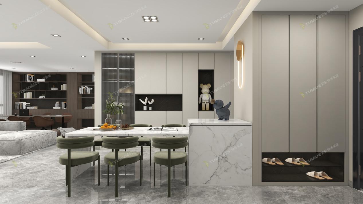 整面墻的餐邊柜,收納“一柜”搞定,再加入鋁框玻璃門來增加設(shè)計感,也在空間內(nèi)營造輕奢的氛圍。