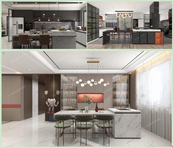餐桌與島臺拼接的形式適合大戶型的開放式廚房使用,島臺與餐桌使用不同材質(zhì),甚至在不同平面上的設(shè)計可以稱為拼接。