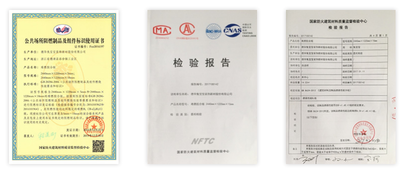 兔寶寶難燃板每一層板芯均經(jīng)過浸漬阻燃處理,經(jīng)過國家防火建筑材料質(zhì)量監(jiān)督檢測(cè)中心檢測(cè),達(dá)到難燃B1級(jí)的規(guī)范要求,起到較好的阻燃作用。當(dāng)遇到火災(zāi)時(shí),可以有效地起到抑制明火,減少熱量,從而為逃生和消防到達(dá)盡量爭取時(shí)間的作用。經(jīng)國家防火建筑材料質(zhì)量監(jiān)督檢測(cè)中心檢測(cè),產(chǎn)品的單體燃燒性能、可燃性、產(chǎn)煙毒性等級(jí)符合國標(biāo)GB8624-2012《建筑材料及制品難燃性能分級(jí)》B1級(jí)阻燃材料的要求,同時(shí)符合國標(biāo)GB20286-2006《公共場(chǎng)所阻燃制品及組件燃燒性能要求和標(biāo)識(shí)》的規(guī)范要求。