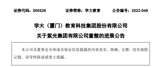 公告稱,2022年7月13日,學(xué)大(廈門)教育科技集團股份有限公司收到紫光集團有限公司管理人的告知函。