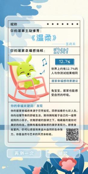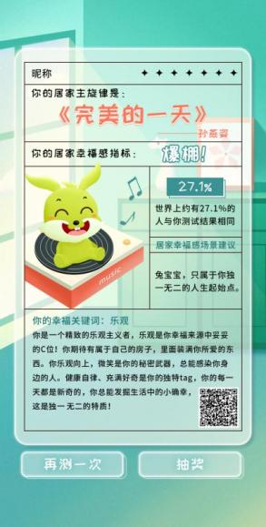 綠色卡通的兔寶寶形象、音樂與問答的趣味組合、居家主旋律及居家幸福感場景的個性解讀……聚焦于年輕消費者對自我的探究,兔寶寶以與網(wǎng)易云音樂合作的測試H5為載體,在迎合年輕人喜愛音樂的同時,充分融合社交屬性,通過音樂與問答形式開啟了一場有溫度的互動,讓年輕消費者、網(wǎng)易云音樂與企業(yè)自身發(fā)生共振,形成共贏。