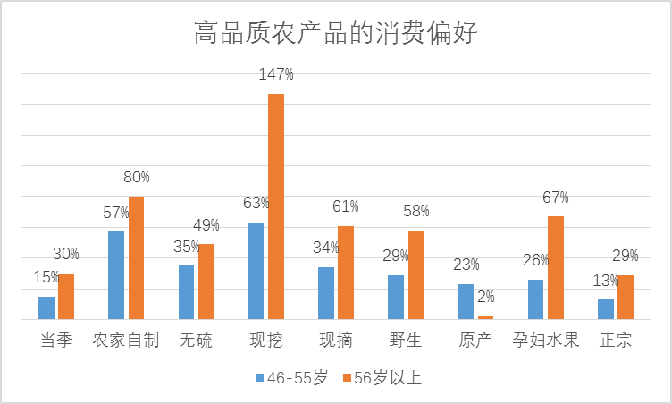 46歲以上消費(fèi)者對(duì)農(nóng)產(chǎn)品的品質(zhì)特征更為關(guān)注。他們更愛買現(xiàn)挖現(xiàn)摘、農(nóng)家自制、野生的農(nóng)產(chǎn)品,對(duì)天然、高品質(zhì)的孕婦水果消費(fèi)偏好也高于其他消費(fèi)人群。