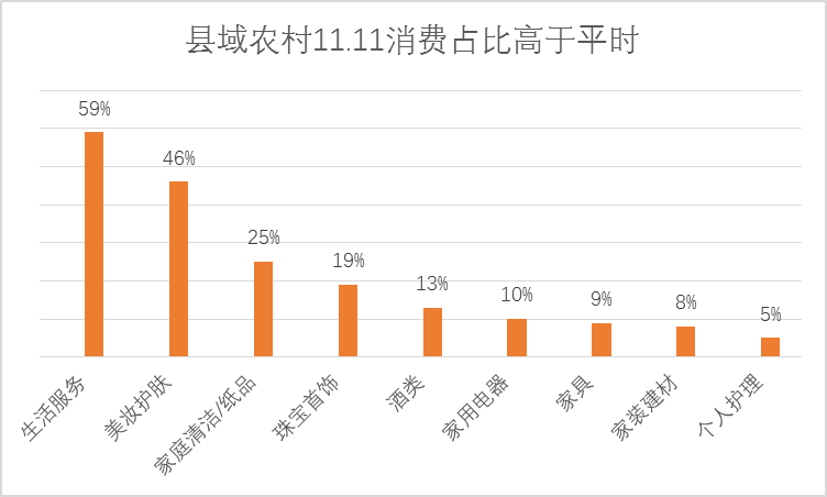對(duì)比平時(shí),縣域農(nóng)村在11.11購買的生活服務(wù)類商品消費(fèi)占比高于平時(shí)59%,購買的美妝護(hù)膚、家庭清潔/紙品消費(fèi)占比高于平時(shí)25%以上,購買的珠寶首飾、酒類、家用電器消費(fèi)占比高于平時(shí)10%以上。可以看出縣域農(nóng)村消費(fèi)者既在京東11.11購買家居日用囤貨,同時(shí)也是消費(fèi)升級(jí)、購買高品質(zhì)商品的契機(jī)。