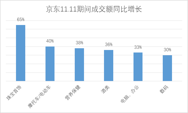 對(duì)比去年同期,縣域農(nóng)村消費(fèi)者在珠寶首飾的成交額同比增長65%,摩托車/電動(dòng)車、營養(yǎng)保健、酒類的成交額同比增長超過35%,電腦/辦公、數(shù)碼增長超過30%。