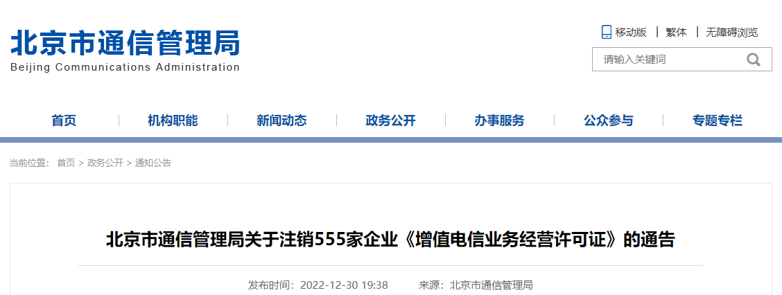 中國(guó)質(zhì)量新聞網(wǎng)訊 2022年12月30日,北京市通信管理局網(wǎng)站發(fā)布關(guān)于注銷555家企業(yè)《增值電信業(yè)務(wù)經(jīng)營(yíng)許可證》的通告。通告稱,近期,北京天洋愛卡電子商務(wù)有限公司等555家企業(yè)已被相關(guān)市場(chǎng)監(jiān)督管理機(jī)構(gòu)依法吊銷、撤銷或者注銷營(yíng)業(yè)執(zhí)照,其企業(yè)法人資格依法終止,不具備經(jīng)營(yíng)增值電信業(yè)務(wù)條件。