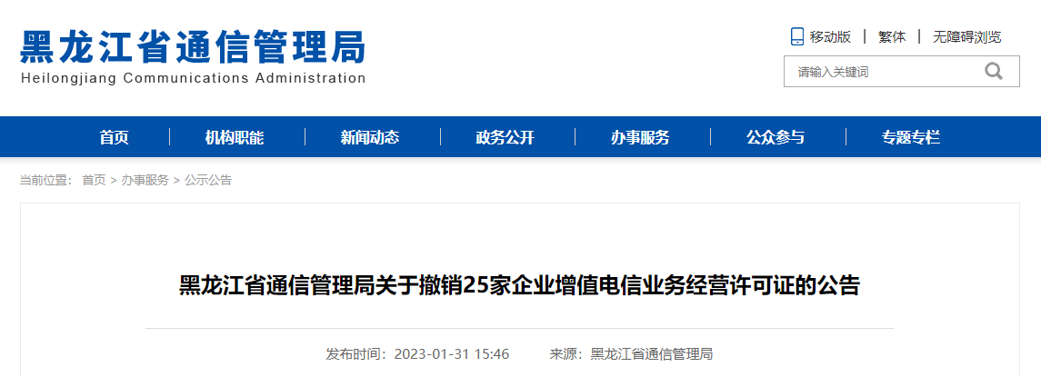 中國質(zhì)量新聞網(wǎng)訊 2023年1月31日,黑龍江省通信管理局網(wǎng)站發(fā)布公告稱,為進(jìn)一步優(yōu)化黑龍江省營商環(huán)境,加強(qiáng)許可準(zhǔn)入、事中、事后監(jiān)管,該局對持增值電信許可證的企業(yè)工商營業(yè)執(zhí)照進(jìn)行事中比對檢查,發(fā)現(xiàn)25家工商經(jīng)營狀態(tài)為“注銷”“吊銷”“吊銷,已注銷”“吊銷,未注銷”等情況的增值電信企業(yè),現(xiàn)對上述25家企業(yè)的增值電信業(yè)務(wù)許可證予以注銷。