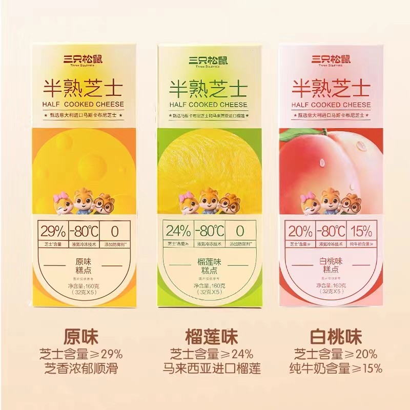 作為國內(nèi)休閑食品行業(yè)最著名的品牌之一,三只松鼠在聚焦堅果之外,根據(jù)實時變化的消費需求及市場變化,持續(xù)上新具有競爭力的精選零食,包括烘焙、肉食、果干等品類。2月14日情人節(jié)當(dāng)天,三只松鼠在其天貓旗艦店上線新品半熟芝士,首期共推出原味、榴蓮味、白桃味三種口味。產(chǎn)品詳情頁顯示,該款半熟芝士產(chǎn)品甄選意大利進口馬斯卡布尼芝士、馬來西亞榴蓮、新西蘭安佳黃油作為基礎(chǔ)原料,0添加防腐劑,從生產(chǎn)到發(fā)貨不超過48小時。
