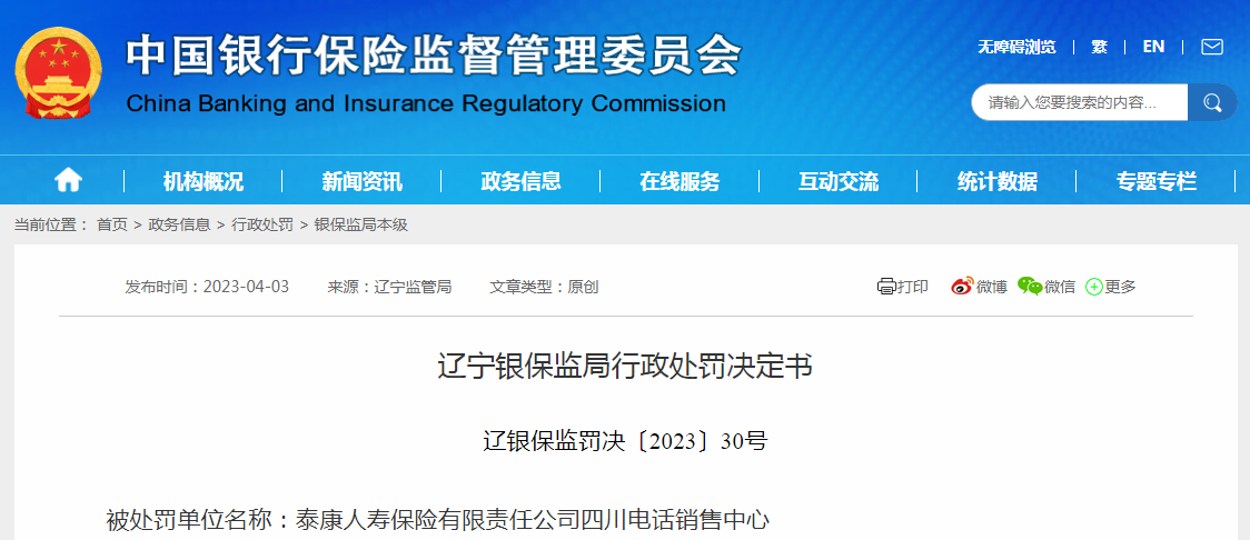 中國質量新聞網(wǎng)訊 近日,遼寧銀保監(jiān)局發(fā)布行政處罰決定書(遼銀保監(jiān)罰決〔2023〕30號),涉及泰康人壽保險有限責任公司四川電話銷售中心。